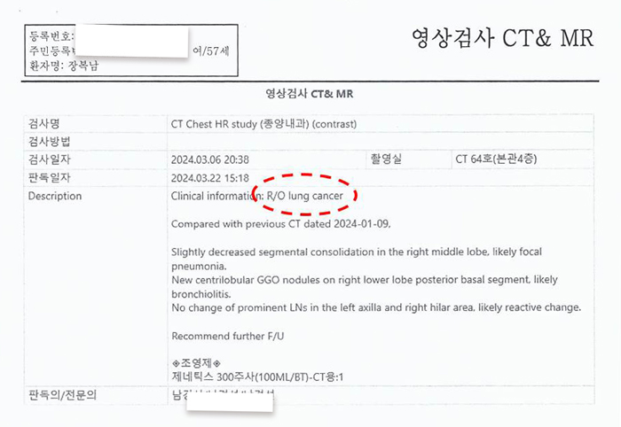 I was diagnosed with pneumonia and the doctor prescribed three weeks’ medications for me. I didn’t take the medicine. My doctor said there was a lump in my right chest blood vessel and advised me to go to a large cancer center.